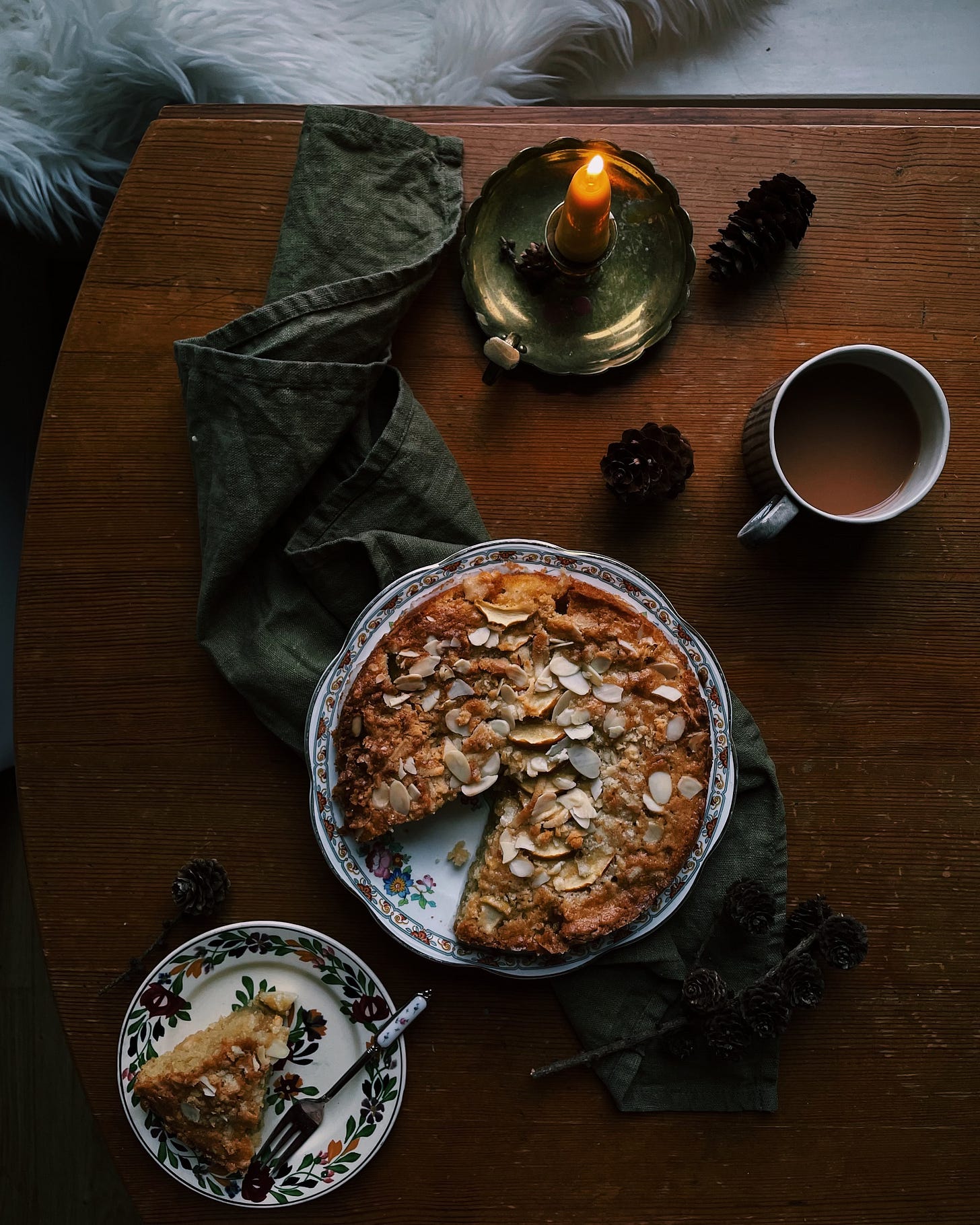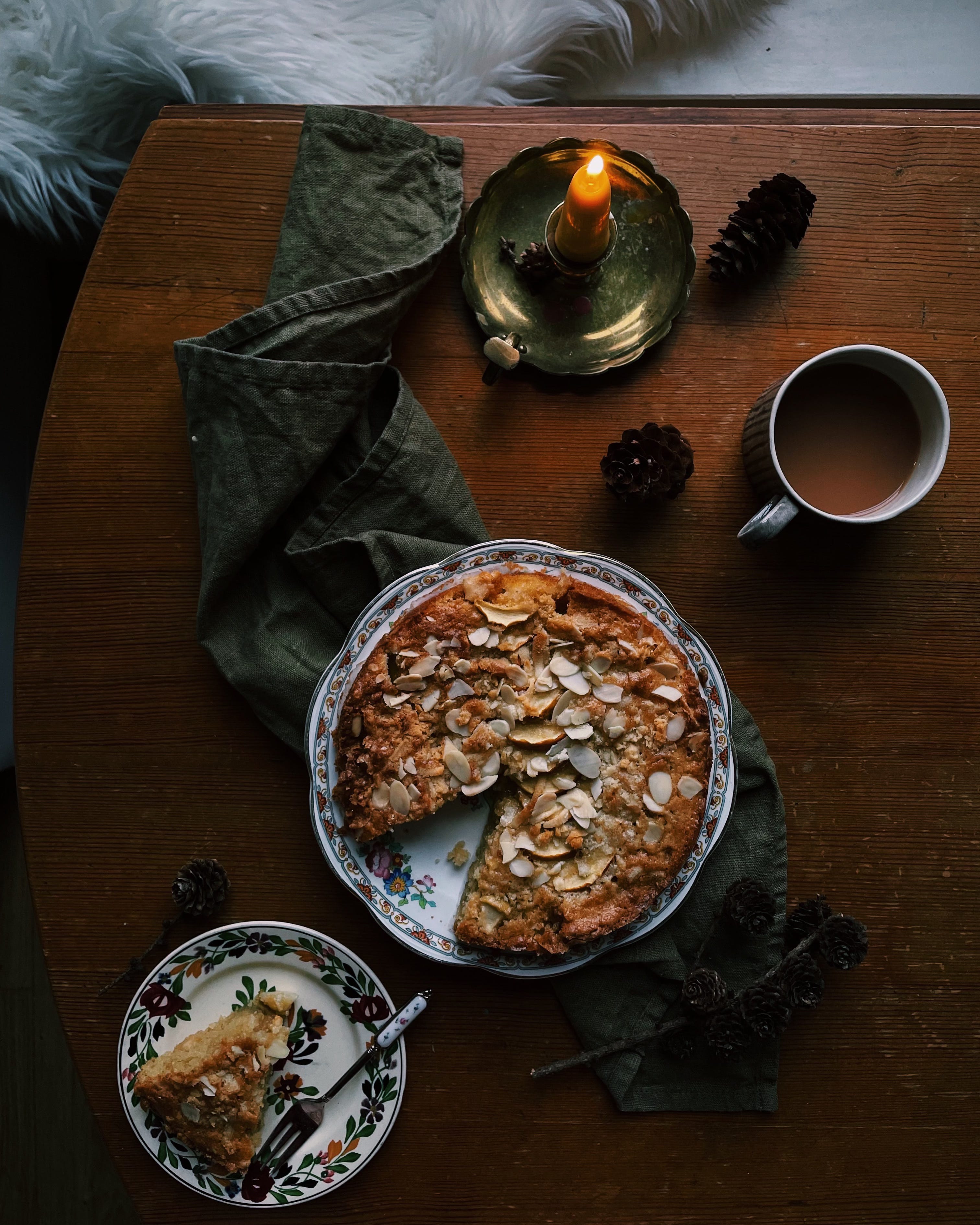 This cake belongs to Imbolc, a season of gentle beginnings when the world is still quiet but signs of new life are starting to appear. We are coming to the end of orchard fruit season, enjoying the last of the apples and pears stored over Winter, and baking with them feels grounding and resourceful. This apple and almond cake has a rich almond sponge with chunks of apple and little pieces of marzipan running through it, then topped with more apple and flaked almonds that turn golden as the cake bakes.